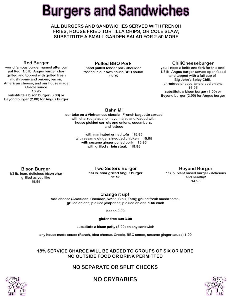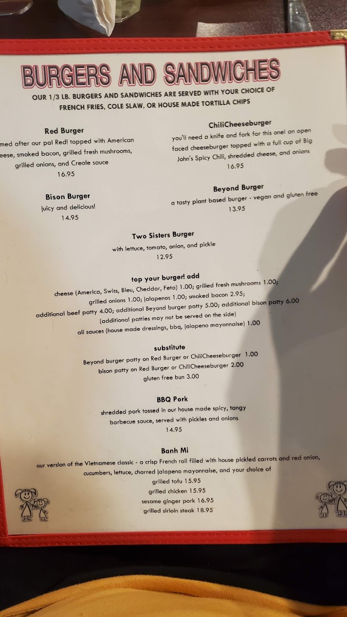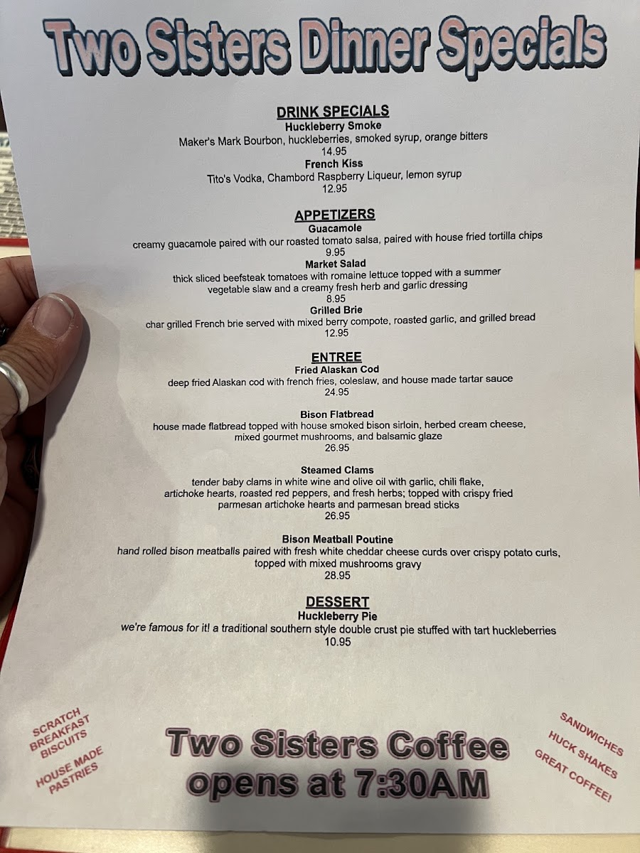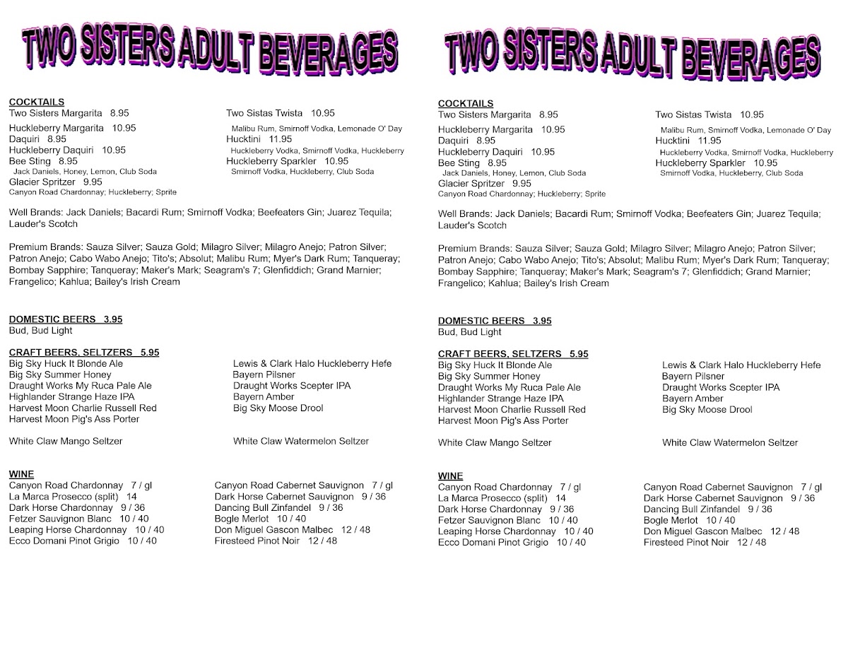 Step into Two Sisters Cafe, a charming spot nestled in Babb, Montana, where culinary delights await. The menu shines with unique offerings like the Trout and Waffles—deep-fried rainbow trout paired elegantly with waffles, huckleberry butter, and syrup for $31.95. For burger enthusiasts, the Red Burger boasts a juicy 1/3 lb black Angus patty topped with bacon, cheese, and grilled veggies, served with crispy fries at $16.95. The drinks are equally enticing, featuring a refreshing Margarita made with fresh lime juice for just $8.95.